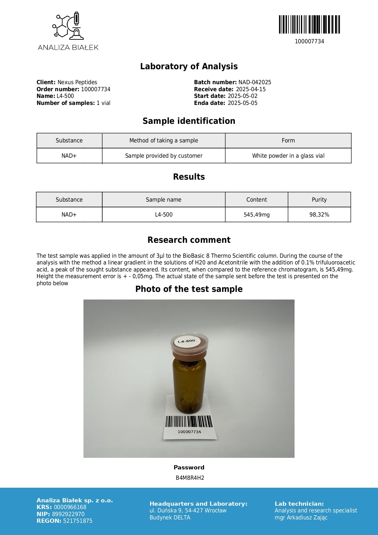 NAD+ is intended for research purposes only. It is not intended for human consumption, clinical use, or diagnostic purposes. Researchers should adhere to all appropriate laboratory safety protocols when handling, storing, and disposing of the product. This description is provided for informational purposes only and does not make any health claims regarding the use of this product.